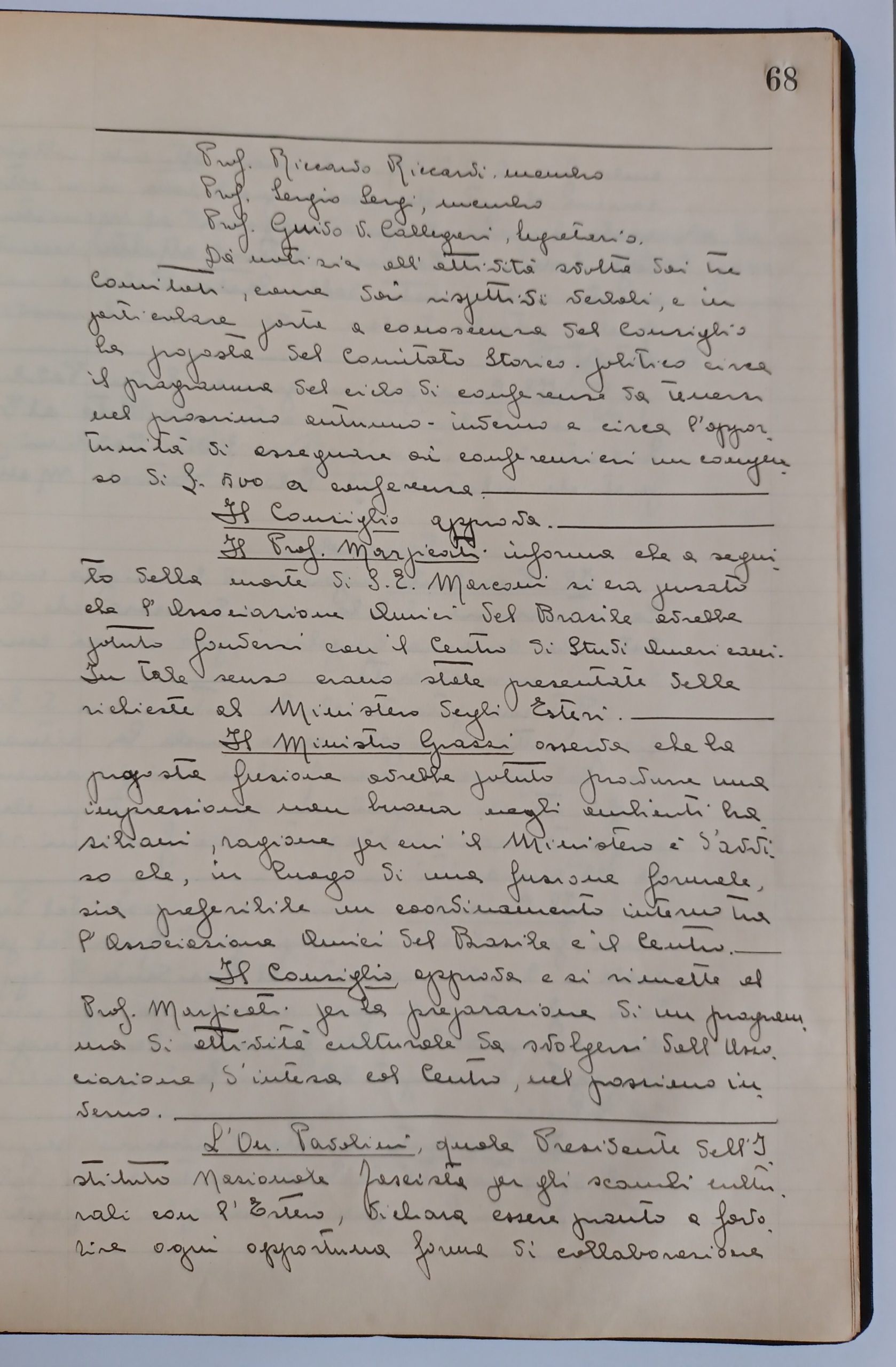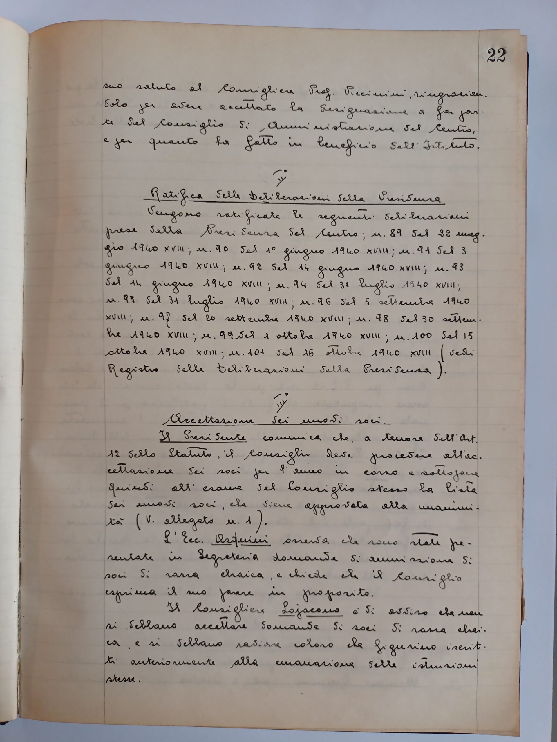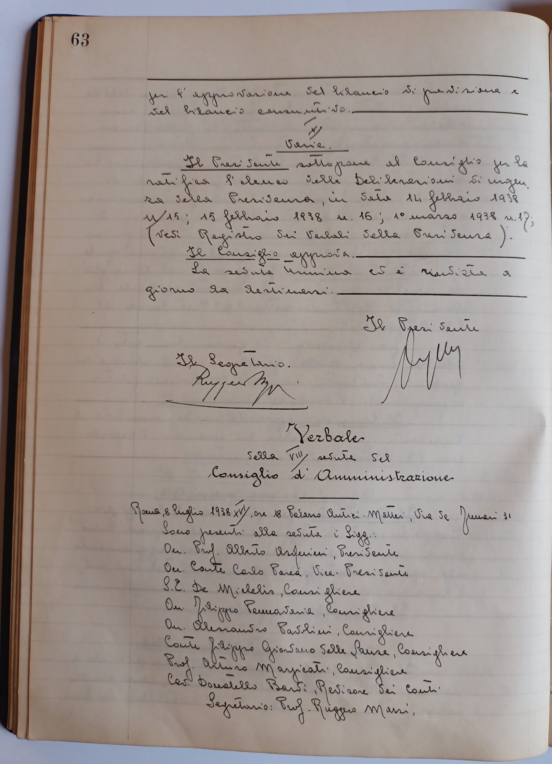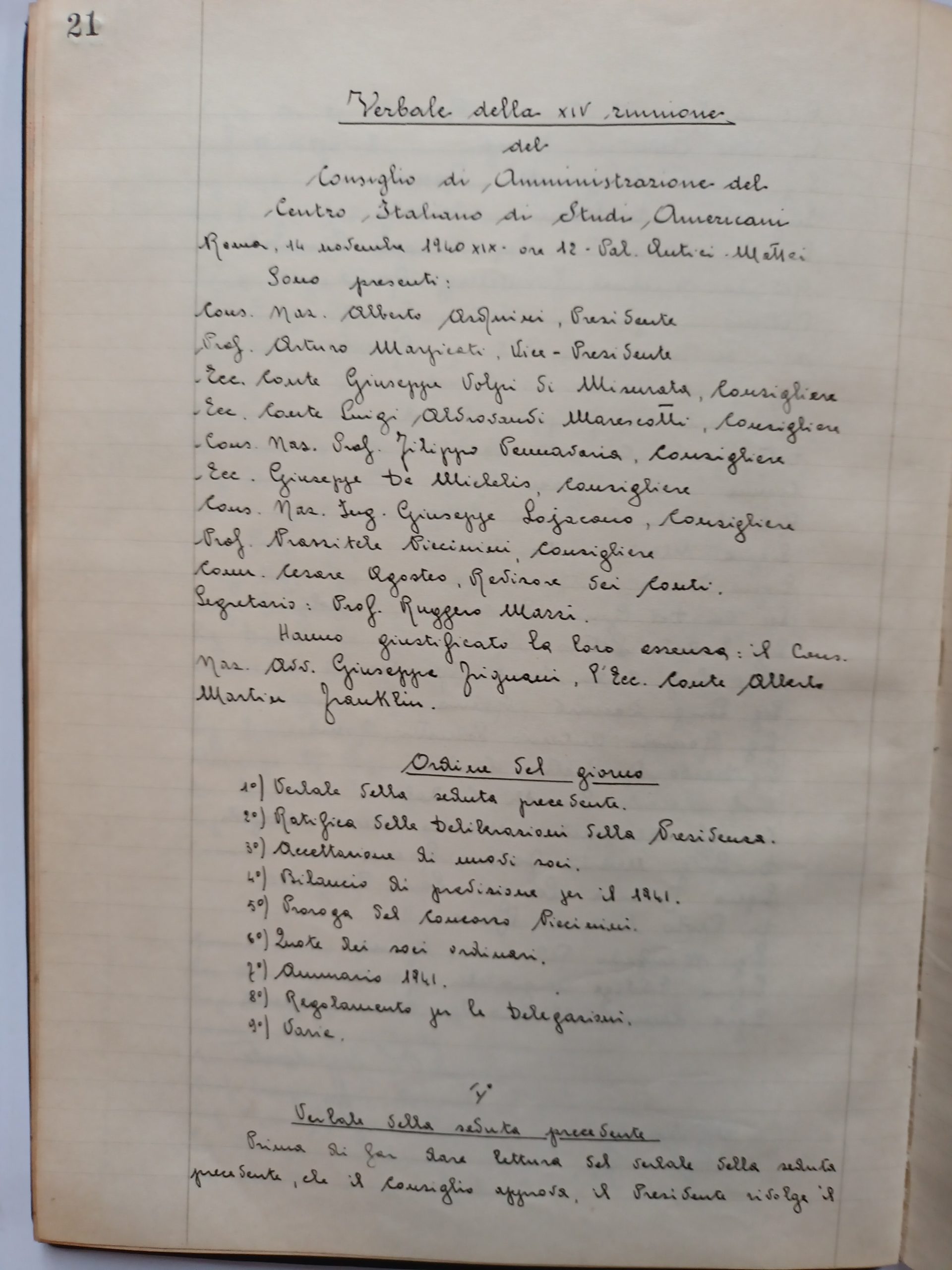 Nella riunione del Consiglio di Amministrazione svoltasi presso la sede di Palazzo Antici Mattei il 14 novembre 1940 l’allora presidente del Centro Italiano di Studi Americani Alberto Asquini, giurista ed esponente di spicco del regime fascista, in merito alla questione dell’accettazione di nuovi soci osservò «che erano state presentate in Segreteria domande di ammissione di soci di razza ebraica» e chiese che il Consiglio esprimesse un parere in proposito. Il parere del Consigliere Giuseppe Lojacono, ingegnere e consigliere nazionale (membro cioè della Camera dei Fasci e delle Corporazioni) fu che «non si debbono accettare domande di soci di razza ebraica, e si debbano radiare coloro che figurino iscritti anteriormente alla emanazione delle istruzioni stesse». Come si legge sempre nel Verbale, il Consiglio di Amministrazione del CISA approvò all’unanimità la proposta del Consigliere nazionale Lojacono «deliberando che venga fatta in tale senso una revisione delle liste dei soci del Centro».