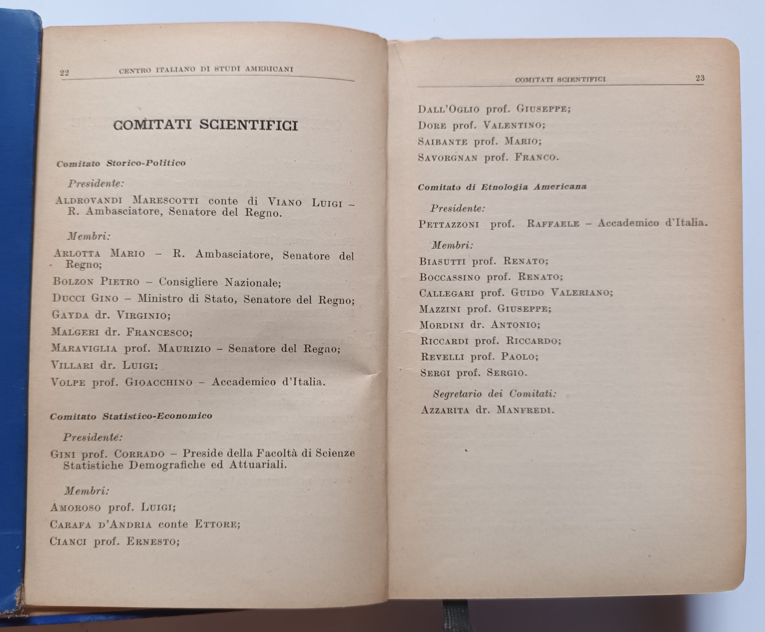 Che i criteri razzisti fossero già in vigore al CISA, però, lo si ricava dalla lettura della compagine di uno dei Comitati scientifici dell’Istituto, il Comitato di etnologia americana, presieduto dallo storico delle religioni Raffaele Pettazzoni. I comitati erano stati istituiti l’8 gennaio 1938; il presidente Asquini ne comunicò ufficialmente la composizione nella riunione del Consiglio di Amministrazione dell’8 luglio, pochi giorni prima dell’avvio della persecuzione antiebraica, avvenuto con la pubblicazione su tutti i giornali del documento Il fascismo e i problemi della razza, il 15 luglio 1938.