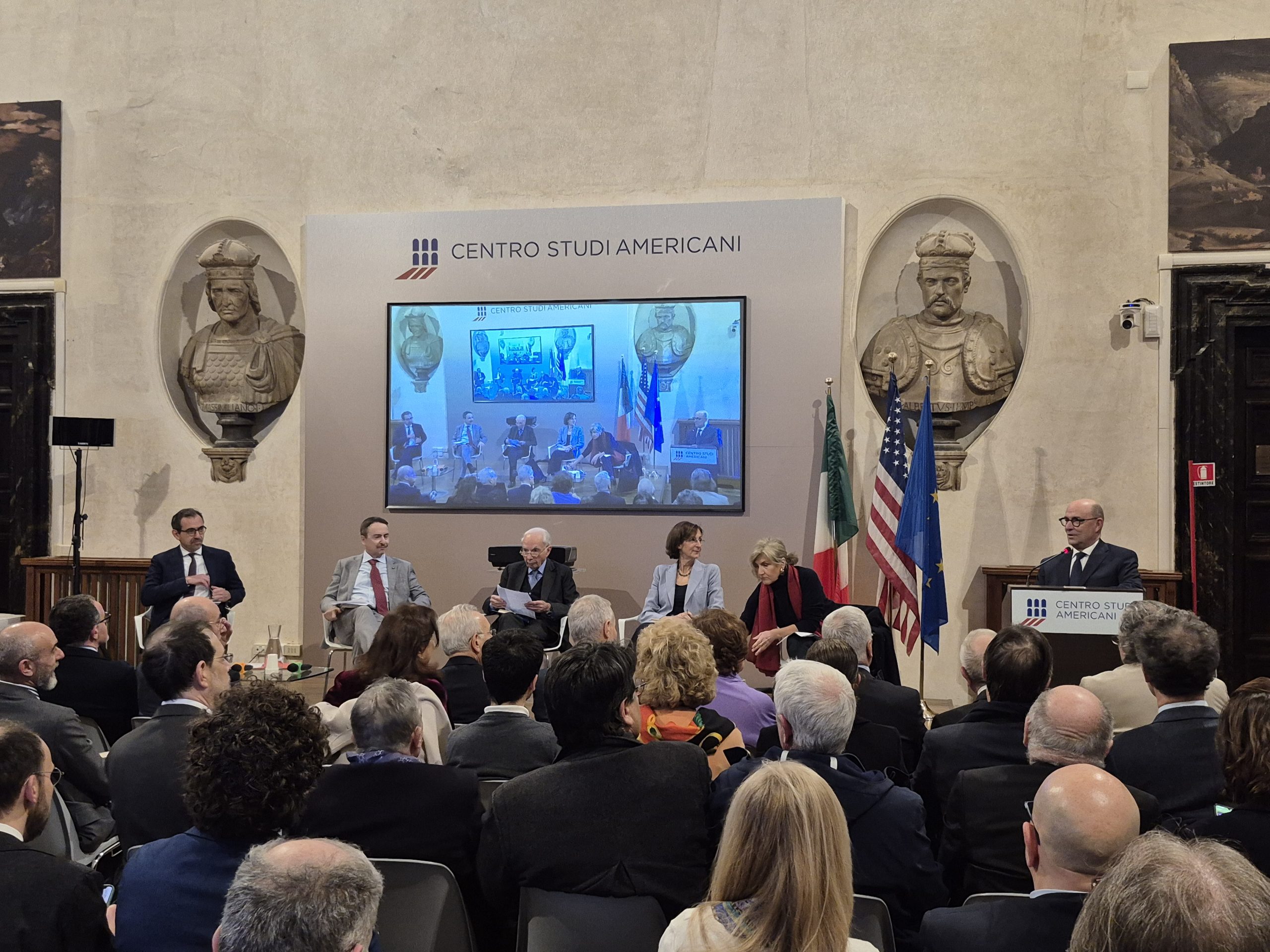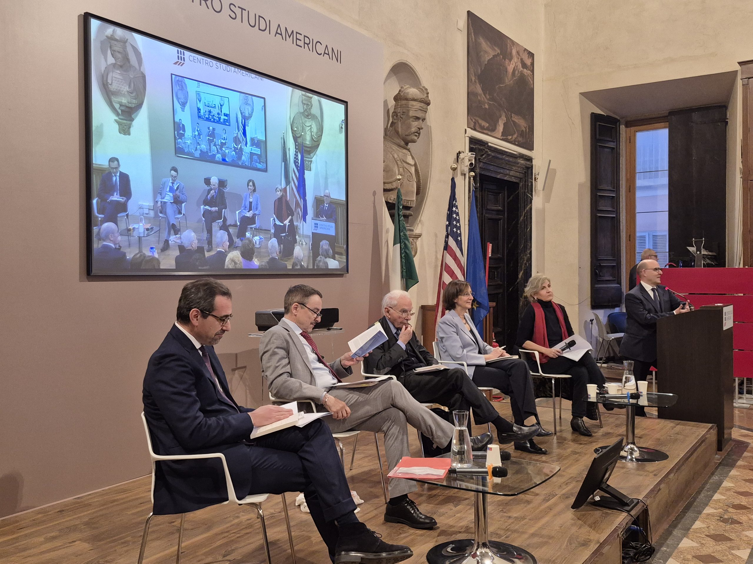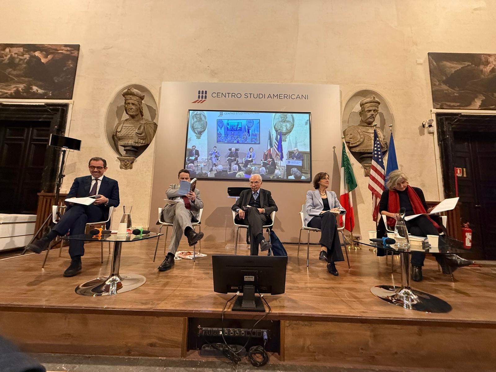 Dopo i saluti di Roberto Sgalla, Direttore del Centro Studi Americani sono intervenuti : Giuliano Amato, Presidente emerito della Corte Costituzionale e Presidente Onorario del Centro Studi Americani, Luca Antonini, Vicepresidente della Corte Costituzionale, Marta CartabiaUniversità Bocconi e Presidente emerita della Corte costituzionale, Francesco ClementiSapienza Università di Roma e CdA Centro Studi Americani. Ha modertato Donatella Stasio, giornalista.